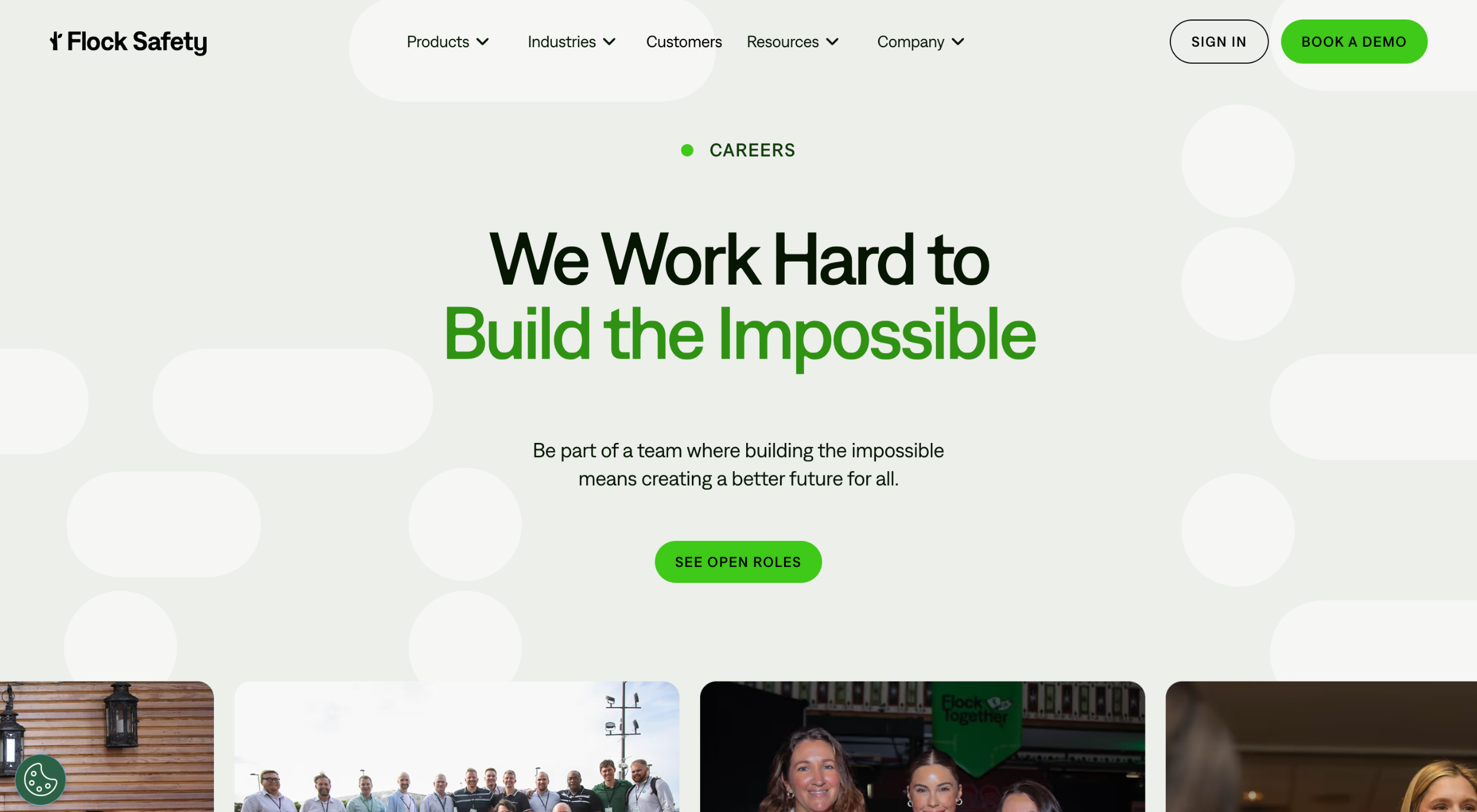 Flock Safety’s career page is bold and mission-driven. The headline “We Work Hard to Build the Impossible” instantly communicates ambition and innovation, while real team photos at the bottom add authenticity.