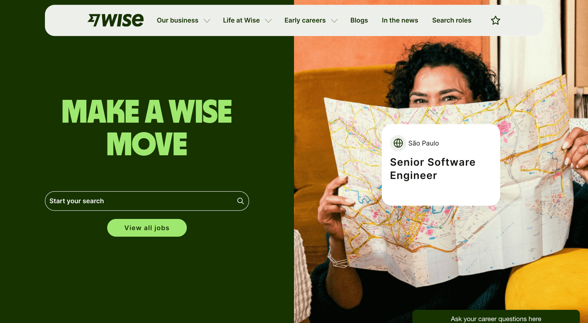 Wise’s career page captures attention with its bold tagline “Make a Wise Move,” immediately making the application journey feel aspirational and empowering. The page combines vibrant visuals with straightforward navigation, ensuring candidates can quickly find roles that suit them.