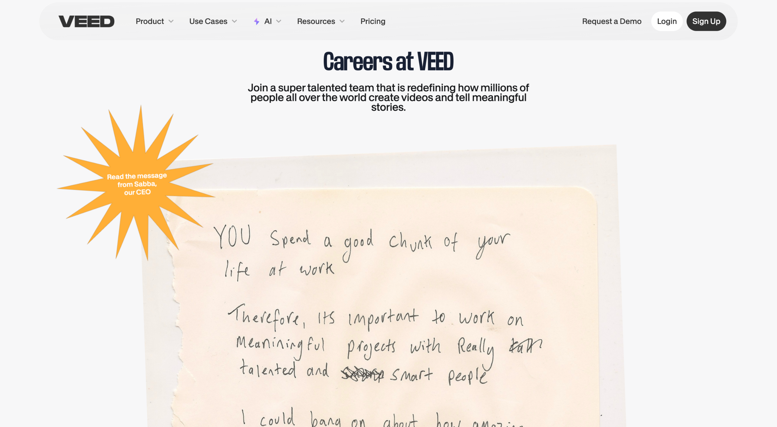 VEED’s career page takes a refreshing and personal approach by opening with a handwritten note from the CEO. This instantly humanizes the company and makes candidates feel valued even before applying. The page emphasizes meaningful work, creativity, and collaboration, aligning well with their video-creation platform.
