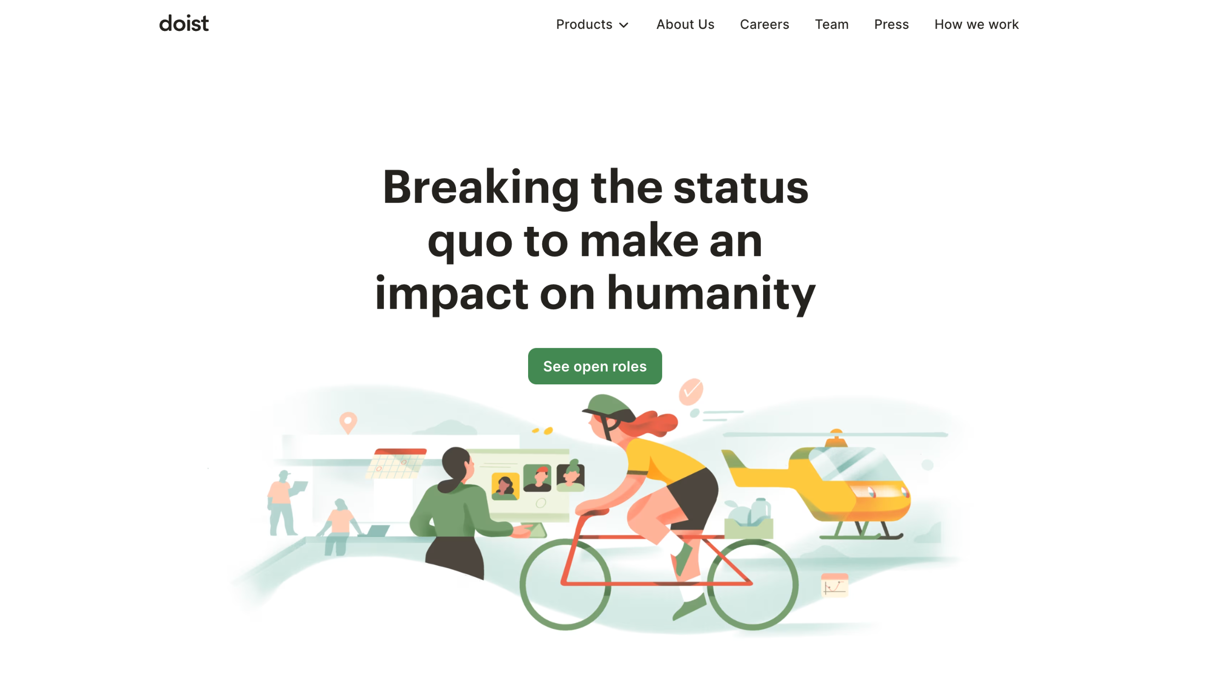Doist’s career page is bold and purpose-driven, opening with a powerful statement: “Breaking the status quo to make an impact on humanity.” This sets the tone immediately, they’re not just hiring; they’re inviting people to join a mission. The page combines clean design, friendly illustrations, and a clear CTA (“See open roles”), making it approachable yet impactful.