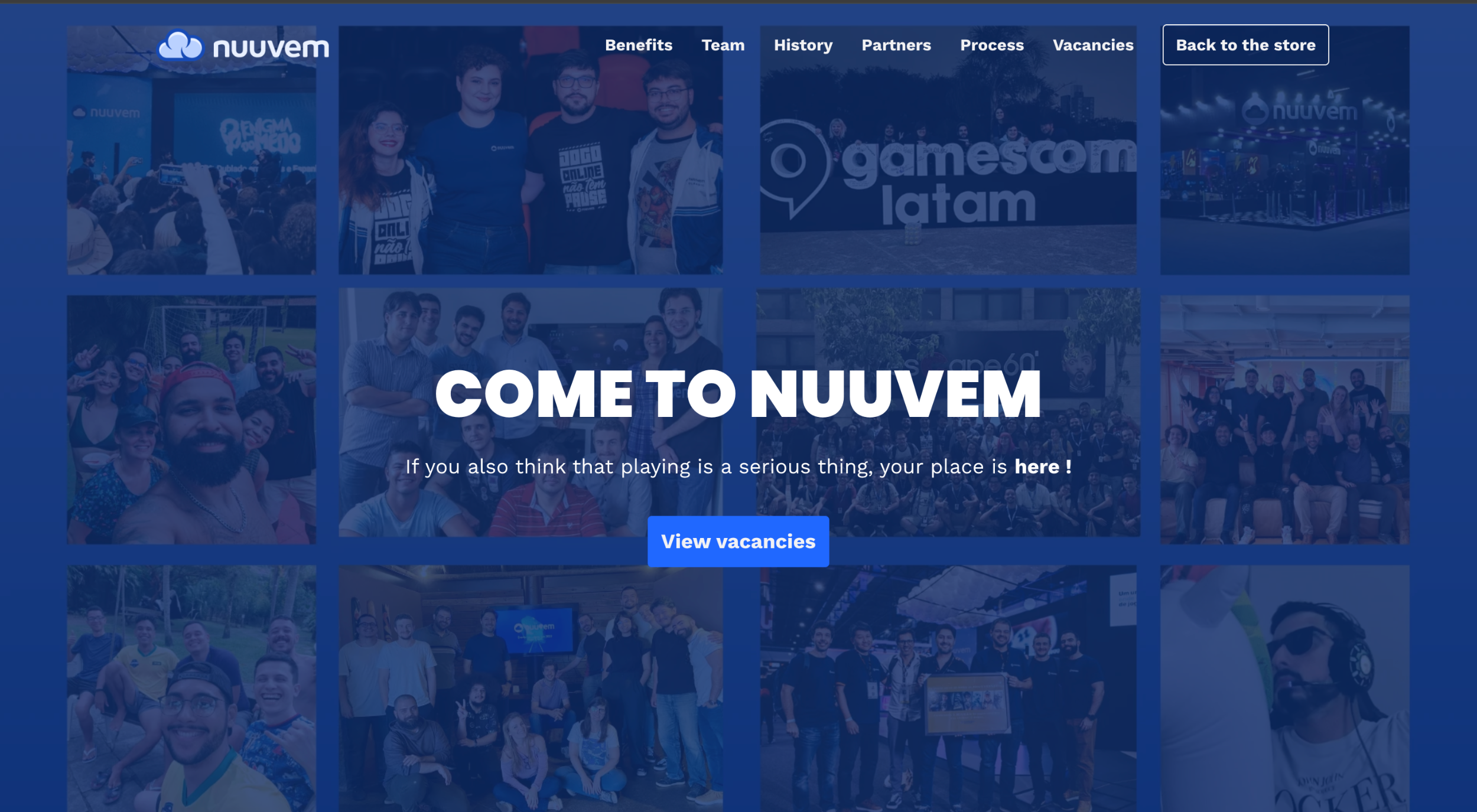 Nuuvem’s career page blends fun with professionalism, reflecting its identity as a gaming-focused company. The bold headline “COME TO NUUVEM” immediately creates excitement, while the subtext “If you also think that playing is a serious thing, your place is here!” perfectly connects passion with purpose. The page is filled with team photos, event snapshots, and behind-the-scenes energy that shows real people and real culture, not stock imagery.