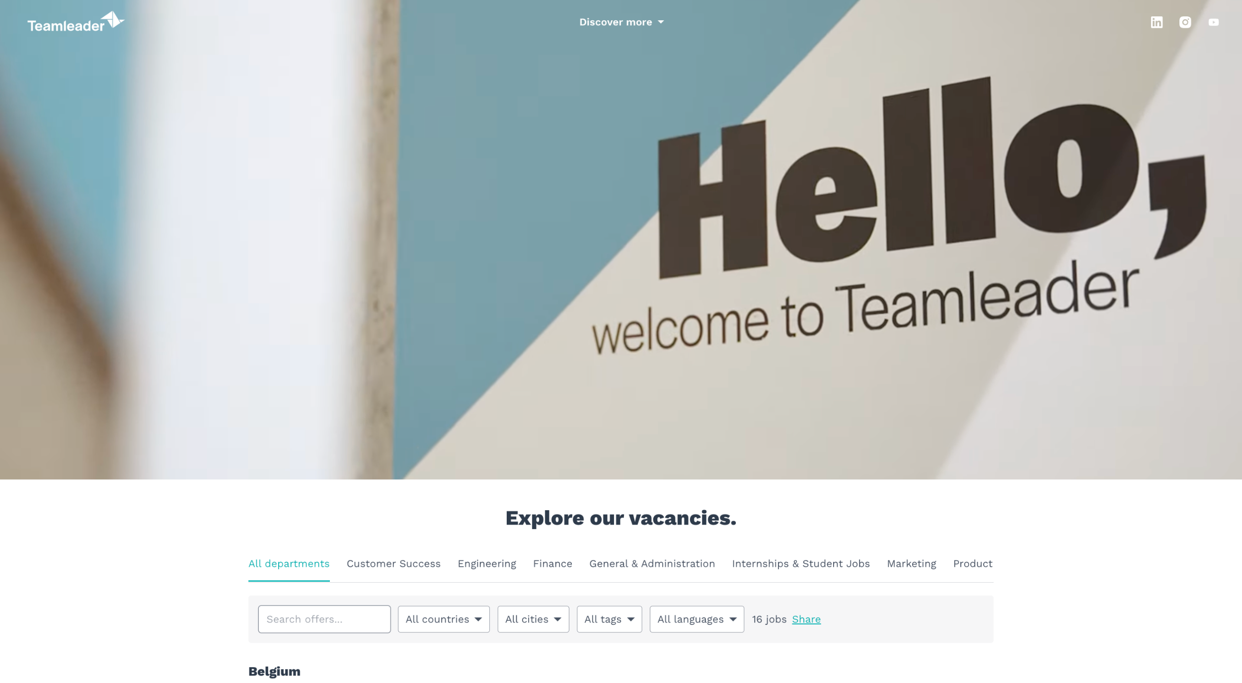 Teamleader’s careers page welcomes you with a video instead of plain text. The “Hello, welcome to Teamleader” intro instantly feels personal and warm, setting the stage for what it’s like to be part of the team. Rather than generic slogans, the video brings their culture alive, showcasing collaboration, energy, and real people at work.