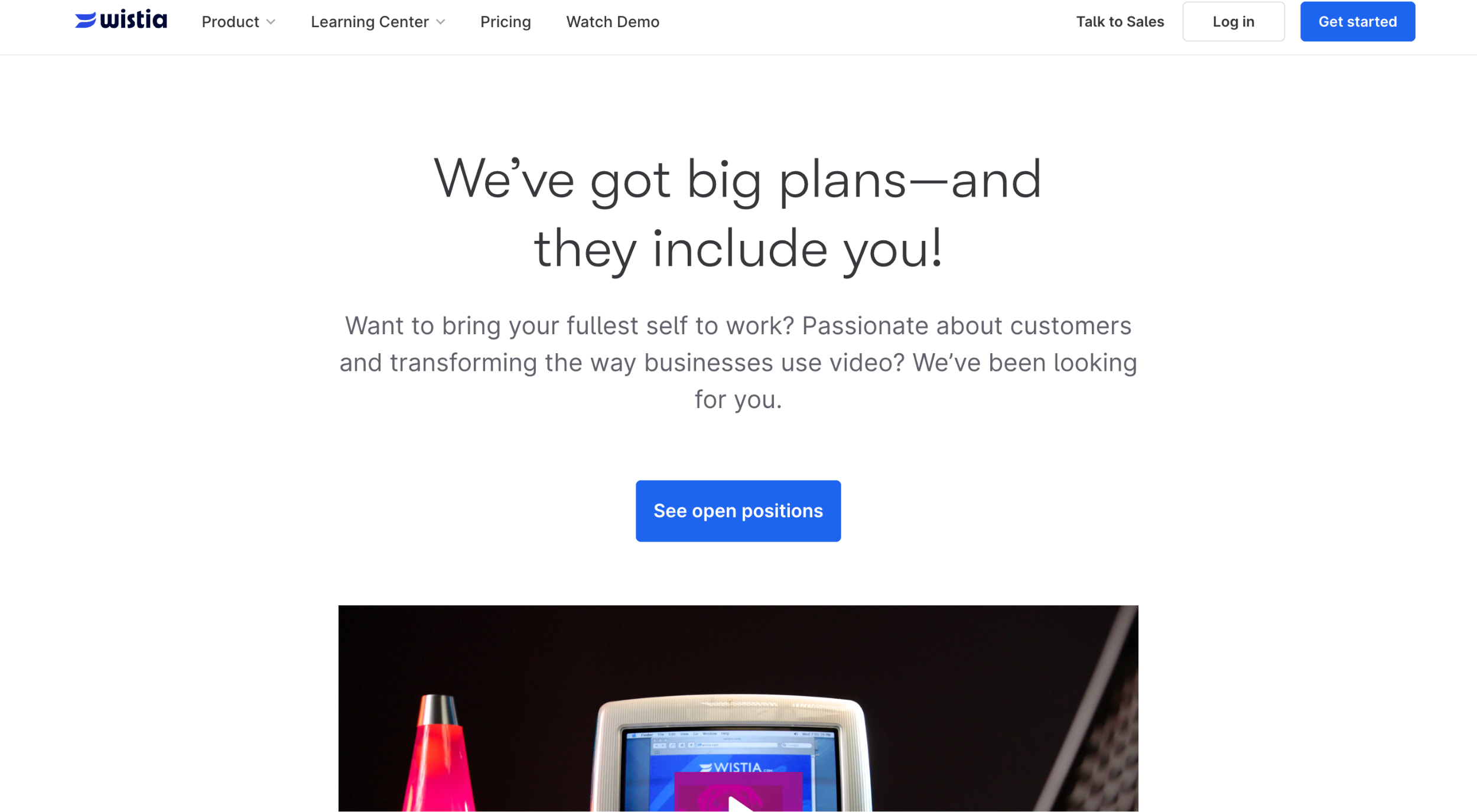 When you land on Wistia’s career page, the first thing you see isn’t just a list of jobs, it’s an invitation. The headline “We’ve got big plans—and they include you!” instantly makes candidates feel like they belong. Instead of corporate jargon, Wistia uses warm, human-centered messaging that speaks directly to people’s ambitions and passions.